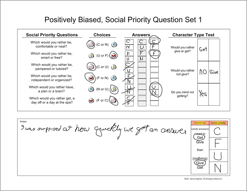 Instructions for the Social Priority, Six Question Personality TestsWhat you'll find below are four Social Priority Six Question Personality Tests. Each test consists of six pairs of Social Priority questions and three character type assessment questions. Together, these nine questions then result in the 5 pieces of information, meant to assess core personality. Please note, the four tests included here have questions which are designed to test people in a normal state of consciousness. Thus, the questions are positively biased; meaning, they are things you do want to happen, or get, or be. How accurate are these tests? Surprisingly so, even if you take only one. However, the way to double check your outcome is to also take at least one negatively biased test. These tests use questions designed to be asked when a person is under stress. Thus, these questions take the form of things you do not want to happen, or get, or be. So where are the negatively biased six question tests? They are in a separate article. However, if you want to do the negative double-check part of the positively biased tests now, you can simply negate any of the positively biased questions, voicing them so they become things you do not want to happen, or get, or be. Remember, it is very important that you answer the questions without thinking and with the first answer you come up with. Be spontaneous, Also, please know that getting the order of peoples' Social Priorities from just six questions requires a bit of skill. However, know that each of these sets of six questions can clearly assess peoples’ social priorities in about 90% of the time. And in cases where they do not, simply have the person take a second test and interpolate the two outcomes. Still no clear outcome? Take a third test, and a fourth if necessary. Still no clear outcome? Try the negatively biased tests. As for interpreting the initial answers from each tests six social priority questions, start by recording the answers in the left most group of boxes, each answer following each question. Next, use the middle group of answer boxes to group answers which have the same upper priority, starting with question one. In other words, if your first question has a “U” on top, look for any other answers which have a “U” on top. Then record the first one you see in the middle column box next to the first question. Then cross out the one you just moved. Next, do the same for the second question and so on, until you have moved all the answers you can so they are grouped next to answers with the same upper priority. Finally, continue this process one more time, looking in the middle column of boxes for the one answer which can go next to a question in the third column. Confused as to what I mean by these instructions? Try looking at the included example page, ignoring the actual questions but looking only at how I have progressively moved the answers progressively so as to reveal a clear social priority order. At this point, you should now be able to identify the person’s four Social Priorities, which you can now record in answer boxes in the lower right corner of the page, the group of four boxes labeled "Social Priorities." You should now have your four Social Priorities, which you can now record in the right group of four boxes labeled "Social Priorities." Now ask the three character type questions, writing the answers in the three boxes to the right of these questions. Here, the first question should give you the person's primary character state; the second question, whether there is a secondary state, and if there is, the third question gives you the person’s secondary state. Please note, there may be no need for the third question, as the person may be a "one" or a "two." Thus, you may only need to ask the first two questions. Even so, it can be a good double check to ask the third and final question, even when you already see an outcome. Again, remember, it is important that the person be conscious and honest. The test validity depends on the person giving spontaneous, straight forward answers. Finally, please know that the main use for these positively biased tests is to determine peoples’ upper pair of social priorities. Thus, ambiguity in the lower pair is common and can be disregarded, as the primary assessment tool for the lower pair of priorities is the negatively biased tests.