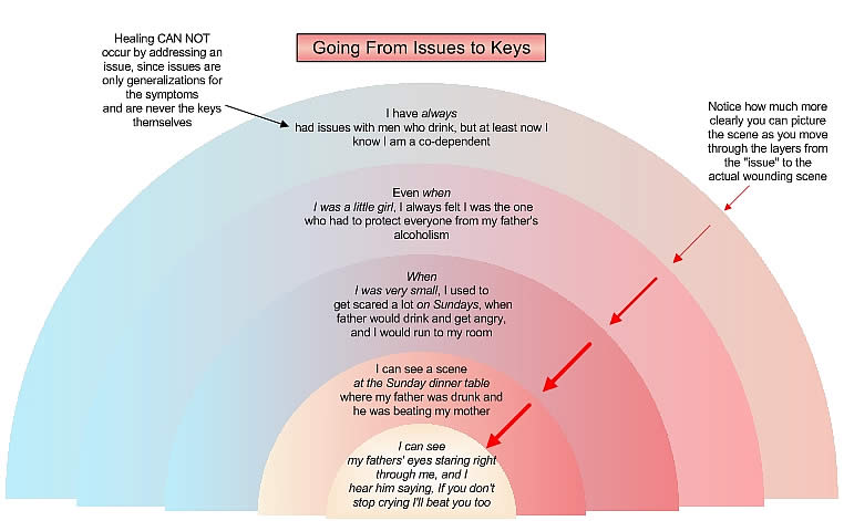 Naming Your "Issues" as a Way to Avoid PainThe more I understand how healing happens, the more I realize how often people avoid the pain of their aloneness, and specifically the painful aloneness they feel during the healing process, by generalizing about their injuries. By this, I mean, most of us, when we talk about our injuries, refer to them in the most general, nonspecific ways possible. We call them, "issues." No surprise, then, that in the diagram above, I have placed one of the more commonly referred to "issues" in the outer most layer. This issue is "codependency," a very commonly used word. Does it help to use this word; to say you are a "codependent?" Initially, I would guess. Recognizing you are injured and acknowledging this injury to others is very important. But what about the healing itself. Does this recognition heal anything? No. Not at all. Not even if you feel better after doing it. So why do people do it? Simply because they do feel better, because by referring to their injuries by these "issue" type names, they depersonalize their injury. They are now just one of the group! Unfortunately, none of this heals anything. Healing requires you face the pain by visualizing the wounding scene or at least a representative scene. My point. Making an impersonal reference to an injury, what we call an, "issue," distances people from their pain. And while this is not always a bad thing to be sure, healing occurs only when you do face this pain. Now read through the five layers, from the outer layer in. And if you picture the words as you read them, you will notice that the experiences come more and more alive. This sequence very much represent a typical healing process during visual dialogue.
