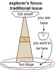 Goal: to move the explorer's focus from the interpersonal (from the realm of the guide - explorer) to the "too large" personal (to the realm of the explorer's intuition). Size of the final stage: still too large, but focused only the explorer. At this level, the guide's goal is to help the explorer to create what amounts to a traditional "issue." So while a traditional issue is too vague and impersonal to actually be a good stage for healing, it can be used to create a good issue statement, a sentence or phrase which is a good stage for healing. What makes a traditional issue a poor stage from which to heal? A traditional issue is so vague and impersonal that when asked to picture it, most explorers will either see only "floods" of pictures, which will cause them to get lost in trying to choose a picture, eventually putting them into indecision and shock, OR, they will get lost in a "blank page;" in essence, trying to resolve the indecision about which picture to chose will put the person into shock and they will see nothing. Finally, even when traditional issues do generate pictures in explorers, the pictures they generate can, at best, only stimulate "outside," mostly mental experiences in the explorer (as if they were coming from the person in the role of a "critic," a "watcher," or an "analyst," etc.). Thus, while traditional issues make poor stages from which to heal, they can be used to develop "issue statements." And because "issue statements" are specific enough and personal enough to be pictured, they will easily stimulate "inside" experiences in the explorer (living inner visions) and so, can readily be used as starting points from which to heal. Examples of questions which can be asked in order to help an explorer to the first level would be: