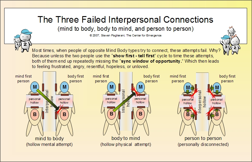 The fact that the two most common failed attempts at connecting; Mind to Body failures and Body to Mind failures, occur, not because people do not try, but rather, because a Mind First person and a Body First person do not, by nature, know how to connect. And they can connect. And stay connected. But only if they use the Show First - Tell First Cycle.